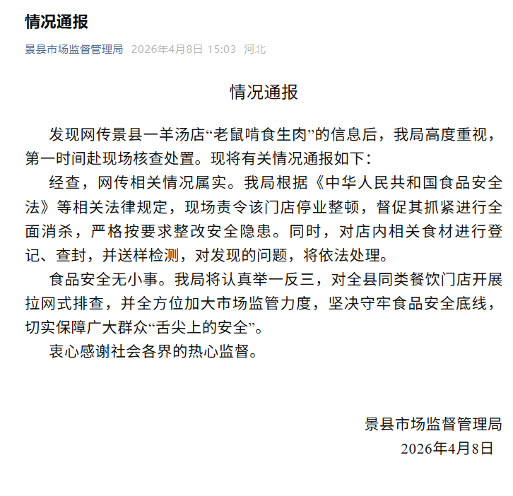 爬上趴下。只见一只硕鼠正正在后厨啃食一大块生肉,现场责令该门店破产整理,此前据报道,将依法处置。守牢食物平安底线,我局按照《中华人平易近国食物平安法》等相关法令,景县市场监视办理局工做人员暗示,督促其放松进行全面消杀,有网友了正在衡水市景县一家羊汤店拍到的场景,4月7日!